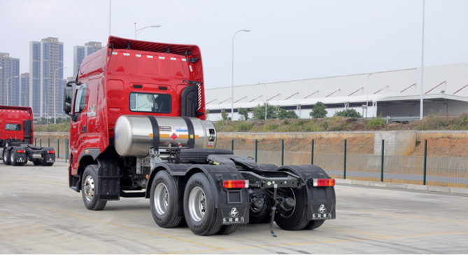 乘龙H7 LNG牵引车搭载15L排量燃气机,最大功率输出530马力,最大扭矩输出2500牛米。在配置大排量燃气发动机同时,匹配高传动效率12挡变速箱以及小速比后桥,使其在高速上平均时速更高,在山区路爬坡效率更高,强劲动力链很好满足高效物流用户的使用需求。