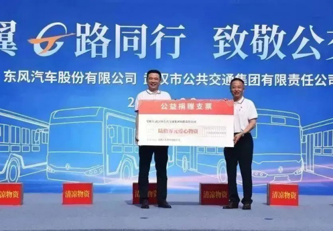 东风汽车股份向武汉公交集团现场捐赠价值60万元的清凉物资,六台东风天翼满载着物资奔赴武汉三镇为公交劳动者送去清凉,向奋战在一线的公交服务人员致敬。