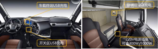 车门两道密封,变速操纵,前围等处均采用密封措施,使驾驶室密闭性、室内噪声达到国际标准。整车内饰配置做到“想用户之所想”,储物空间达1350L,收纳方便。驾驶室内设6处不同位置的插座和接口,用户充电不用愁。方向盘集成多功能开关,车载调节、接打电话、巡航控制,一应俱全。同时,配备了12.3寸全液晶仪表屏,车速、转速、里程表、气压、电压故障警告等各类信息显示,一目了然。