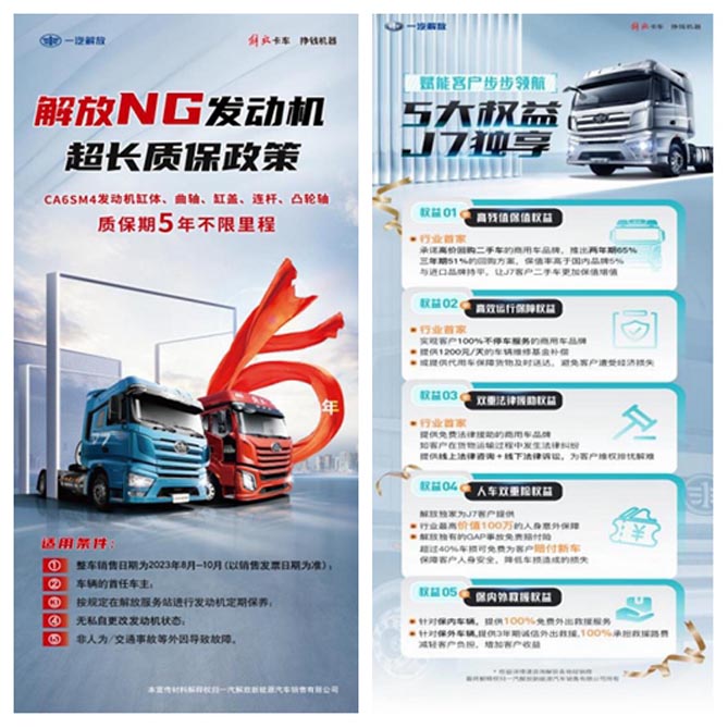 J7 LNG车,同时享有一汽解放NG产品专属服务政策,用户拥有超长质保、不限里程的感动服务。一汽解放的售后服务如此“给力”,就是为了能让广大解放用户安安心心把钱赚,踏踏实实做您路上的好伙伴!