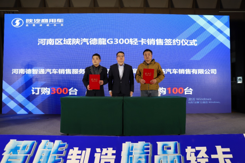 在现场热烈的氛围中,本次会议现场签订德龍G300轻卡1010辆,斩获德龍轻卡终端订单101辆,充分体现了德龍G300强大的产品力,和广大卡友对陕汽商用车的认可和支持。