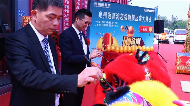 在闽南商业文化中,舞狮点睛是开业盛典不可或缺的传统仪式,寓意着唤醒生机、纳福聚财。盛典现场,奇瑞商用车生态事业部总经理江文波与泉州迈源鸿总经理洪传评共同执笔,为祥狮点下点睛之笔:一点左眼,生意兴隆;二点右眼,财源广进;三点额头,前程似锦。朱砂落定,祥狮醒舞,腾跃辗转间尽显气势,象征着泉州迈源鸿好用车超级旗舰店与福建首家好用能途配门店,在闽南大地正式开启蓬勃新程。