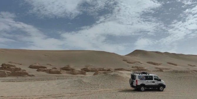 “别问我为什么,干就完了!”小马哥猛踩油门,车尾扬起的尘龙陡然拔高,车影如鱼跃龙门掠过沙丘,沙粒似火星溅射,在夕阳的余晖里闪烁,转瞬又被风卷揉进尘幕,化为这狂野画卷中的点睛之笔。“就这个feel 倍儿爽!”他满意地夸赞道:“玩越野差不多有近十年了,开过的越野车差不多也有十多款,综合来看,最适合我的还是依维柯的这辆欧霸·山海。全时四驱三把锁,高适应性的全地形轮胎,高强度钢的车身底盘,这些都非常给力,而我最满意就是一个‘大’字。大空间,差不多得有13m³,可以放很多东西,睡一觉都没问题,油箱也够大,80L+20L续航持久,深入无人区也完全不慌,再就是发动机这一块了,F1C3.0T的强大动力可真不是盖的,179的马力和430的扭矩,30度斜坡照样一脚油门就上去了。”戈壁深处,机械的轰鸣与自然的寂静达成了奇妙的平衡,欧霸·山海是闯入者,亦是这荒原交响曲的演奏者。它用速度撕裂寂静,用尘烟书写轨迹,最终又与晚霞、沙丘、风一起,熔铸成戈壁永恒的苍茫与壮美。
