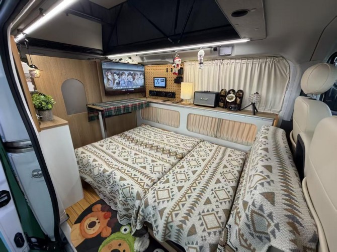 内饰空间设计兼顾实用性与舒适性,整车配备142L房车专用大容量冰箱,可长期储备生鲜食材、饮品零食,户外生活也能尽享新鲜美味;车内打造一体化餐厨区,集成吸油烟机、隐藏式洗菜盆、多功能控制区,搭配丰富储物柜与置物架,让户外生活告别杂乱,便捷有序。空间灵活性方面,车型采用一物两用的会客卡座设计,白天可作为休闲交流、办公创作、间,夜晚通过伸缩扩展即可变身舒适大床,收纳不占额外空间,兼顾休闲、住宿、储物多重功能,完美适配情侣出行、家庭旅居、好友结伴等多场景需求。