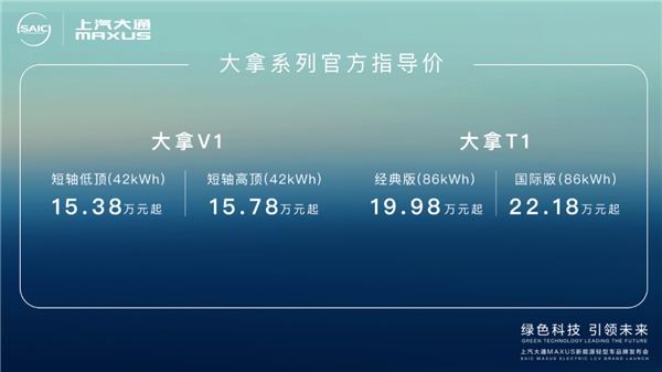 秉承上汽大通MAXUS智能、高效、绿色的品牌DNA,在大拿T1、V1之后,大拿品牌每年还将推出多款车型, 未来2年内,大拿还将推出10款全新新能源车型,全球新能源轻型车新时代已到来,上汽大通MAXUS立足多年的技术积淀,全新品牌、全新平台、全新车型“大招齐放”,为“全球新能源轻型车领导者”再添有力证明。