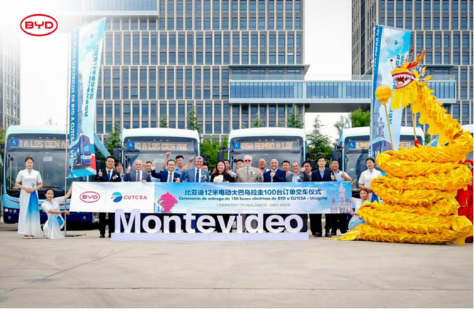 9月19日,比亚迪在其青岛工厂向乌拉圭最大的电动公交运营商CUTCSA交付100台纯电动大巴。这一交车仪式标志着比亚迪在国际商用车市场上的又一重大突破,并进一步为乌拉圭的绿色交通发展注入了新的动能。