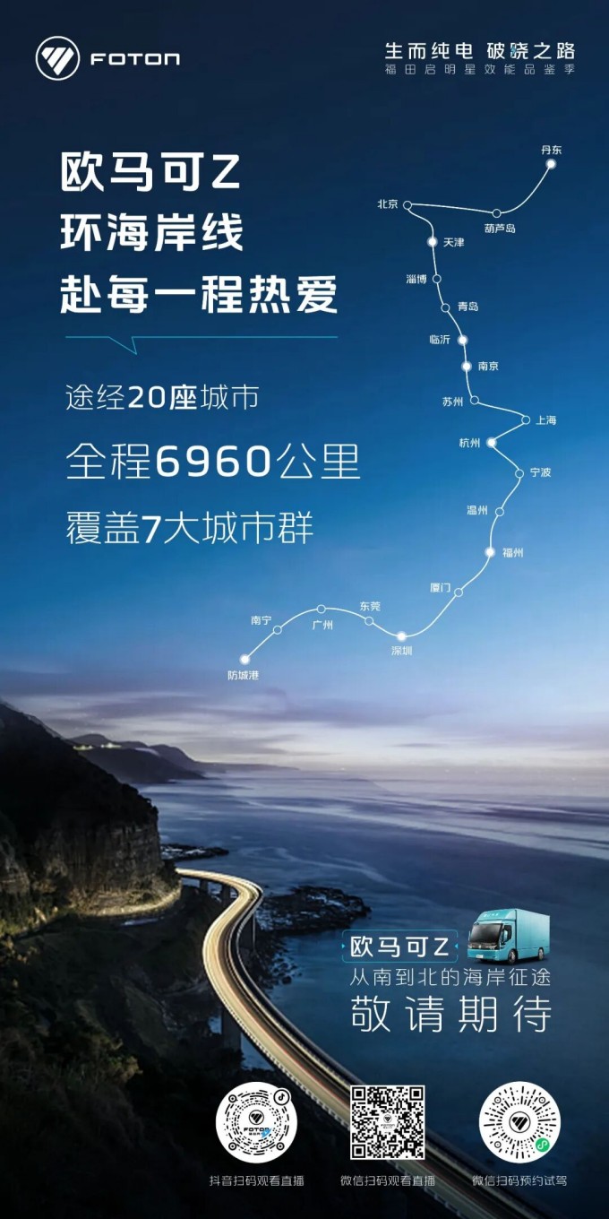 此次“福田启明星效能品鉴季” 活动,欧马可Z将穿越北部湾、珠三角、海峡西岸等‌7大沿海经济带‌,深入‌20座核心城市,直抵万千用户的物流运输一线。聚焦快递快运、冷链运输、绿通配送等多元场景,活动将以“一站一测”的形式,邀请各地用户沉浸式体验智慧生态高端纯电轻卡带来的革新,用真实场景和数据验证产品性能,回应市场对欧马可Z的热切期盼。
