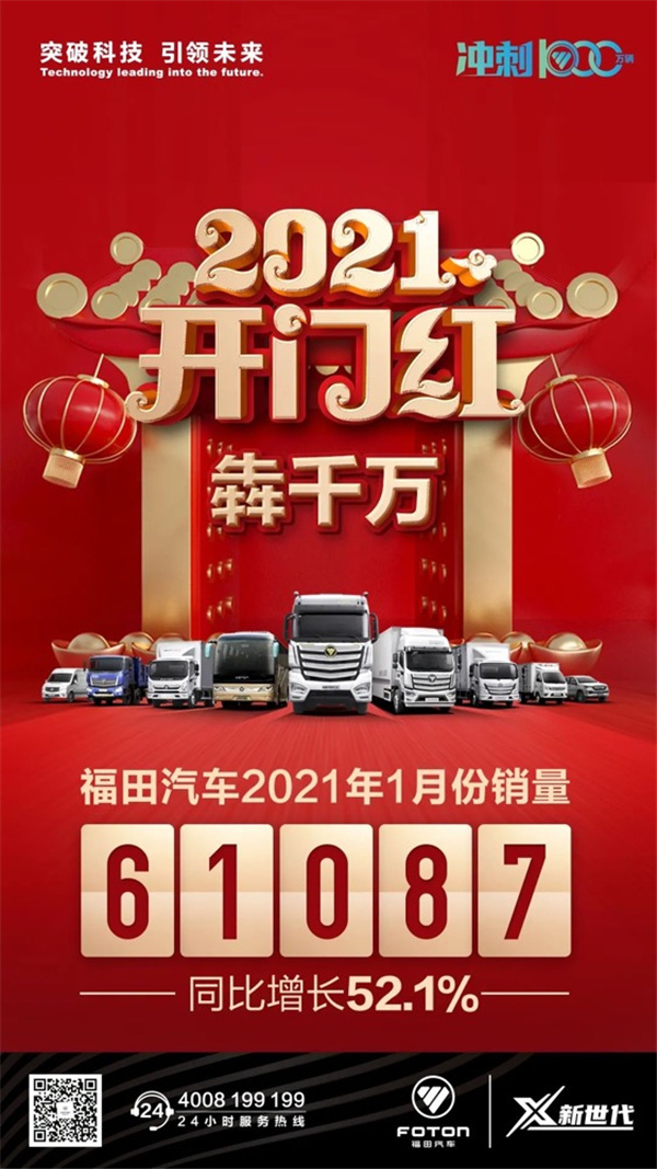 产销数据显示,2021年1月,福田汽车共销售61,087辆,同比劲增52.1%,旗下欧曼、欧航欧马可、奥铃、时代等品牌销量全线飘红,涨势强劲。