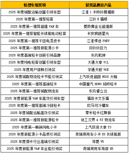 为顺应行业电动化、智能化、网联化、场景化发展趋势,推动轻型商用车市场转型升级,轻型车组创新设立了“2025年度城配运输创富引领车型”、“2025年度新能源VAN车高效引领车型”、“2025年度高端轻卡创新引领品牌”、“2025年度纯电轻客创富引领车型”、“2025年度用户信赖引领奖”、“2025年度城配物流轻卡节能引领奖”、“2025年度微卡行业高端引领奖”等细分领域奖项。