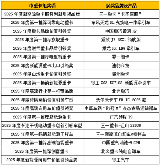因此,以创新激活发展新动能,释放平台长远生命力,成为第一商用车网年度评选活动与时俱进的关键内核。而这份创新活力,在奖项设置中展现得淋漓尽致。为积极响应国家政策导向,深度落实新质生产力发展要求,助力卡车行业高质量发展,年度评选组委会在中重卡组设置了“2025年度新能源重卡服务创新引领品牌”、“2025年度重卡品牌价值引领奖”、“2025年度燃气重卡品质引领奖”、“2025年度新能源重卡出口引领奖”、“2025年度跨境运输价值引领车型”、“2025年度高端专用车价值引领奖”、“2025年度山地重卡价值引领奖”等重磅奖项。