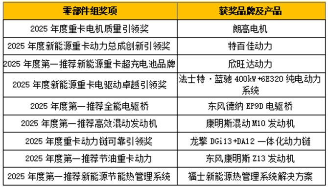 同时,为加速商用车行业绿色化、高效化与低碳化转型进程,零部件组评选紧扣行业发展趋势及核心需求,聚焦动力系统、核心总成等关键领域,针对性地设立了“2025年度新能源重卡动力总成创新引领奖”、“2025年度重卡电机质量引领奖”、“2025年度新能源重卡电驱动卓越引领奖”等年度奖项,全方位覆盖产业链关键环节。